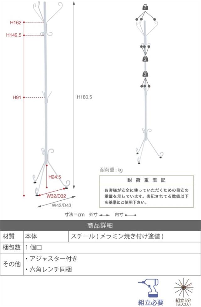 | □外寸 幅43×奥行43×高さ180.5cm □内寸 [上段ハンガーバー]高さ162cm [中段ハンガーバー]高さ149.5cm [下段ハンガーバー]高さ91cm |