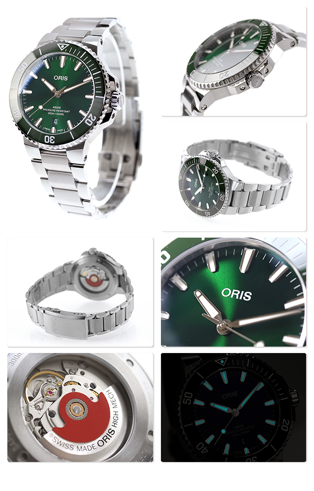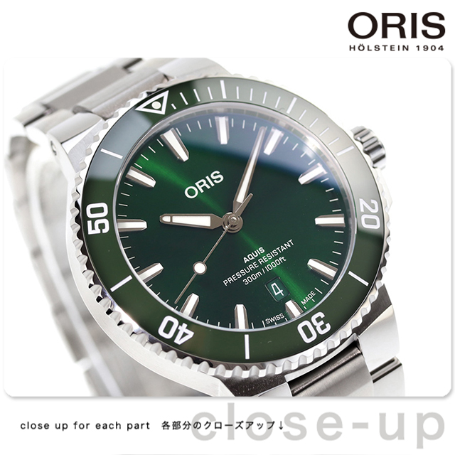 正規品 7年保証キャンペーン オリス アクイス デイト 41.5mm スイス製 メンズ 腕時計 01 733 7787 4157-07 8 22 04PEB ORIS Aquis Date アナログ グリーン ◆ORIS(オリス)は、ポール・カッティン氏とジョージ・クリスチャン氏の2人によってスイスのヘルシュタインで創設されました。近くを流れる小川にちなんで社名をオリスと命名。手頃な価格ながら、革新的で高機能かつ実用的な機能を備えた本格機械式時計で知られ、世界中の時計ファンから愛されているブランドです。 グリーン文字盤のアクイスデイトは自然の美しさを反映する、日常使いの高級ツールウォッチです。スイスが誇る高品質の自動巻ムーブメントと30気圧(300m)防水の性能を備えています。カジュアルスタイルにはもちろん、クラシックな大人の装いにも味わいを添えてくれます。 発売日:2024年4月発売 機械式腕時計