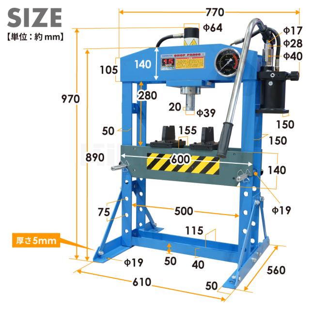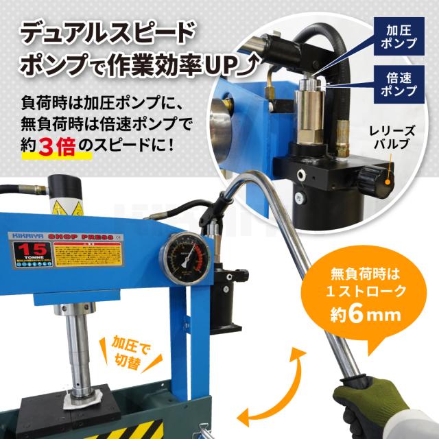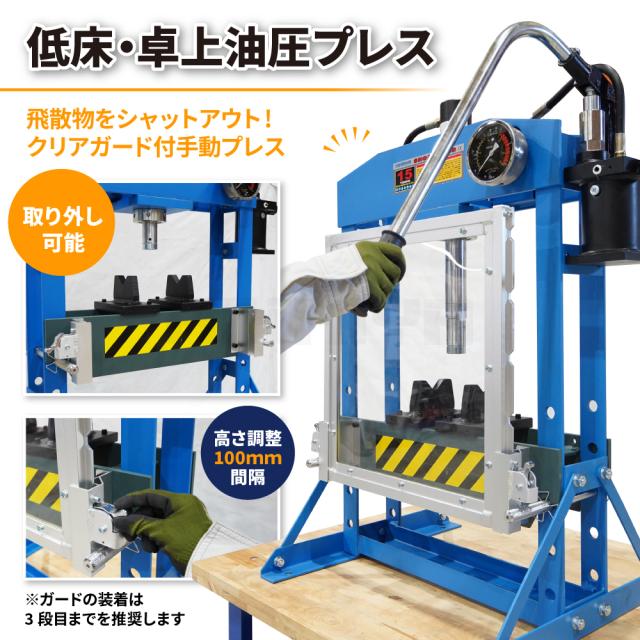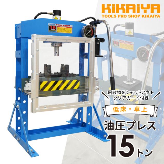 油圧プレス 15トン 低床 卓上 クリアガード 手動 メーター付 ロングストローク 門型プレス機 6ヶ月保証 KIKAIYA