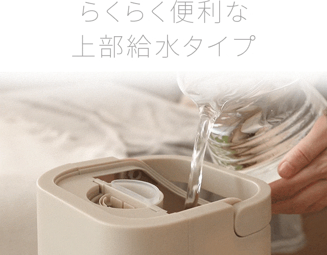本体上部に給水口があり水を流し込むだけなので給水が簡単。タンクは約6.5L入る大容量サイズの為、給水回数が少なく済み就寝時も安心してご使用いただけます。