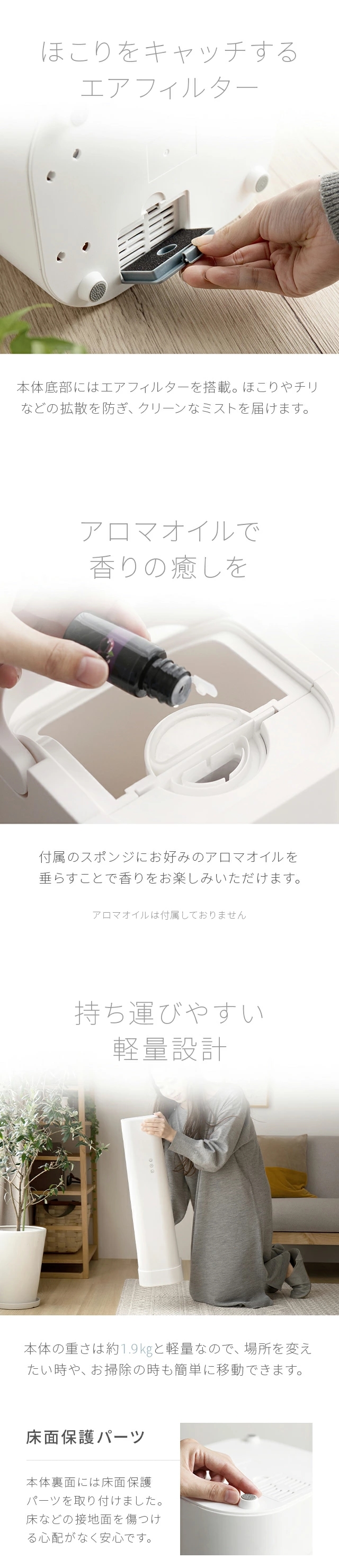 また、本体底部にはエアフィルターを搭載ホコリやチリの拡散を防ぎクリーンなミストを届けます。