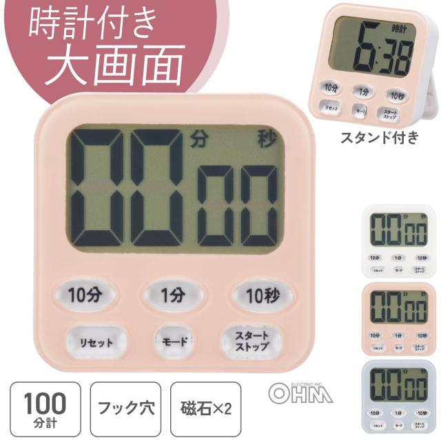 時計付き大画面デジタルタイマー ピンク|COK-T141-P 08-1555 オーム電機