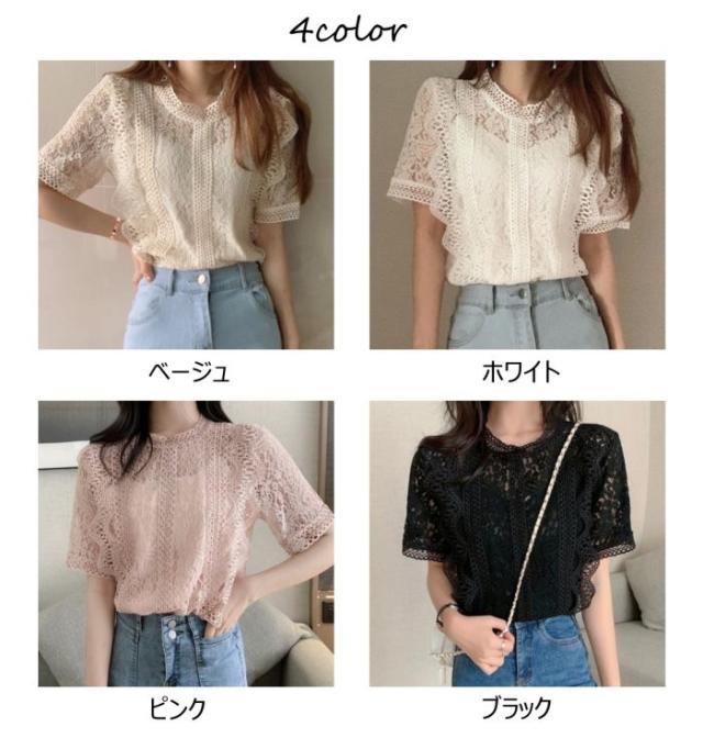 レース ブラウス 白 半袖 レディース 総レース レディトップス 結婚式 二次会 オフィス カジュアル フォーマル オケージョン シースルー シャツ ハイネック