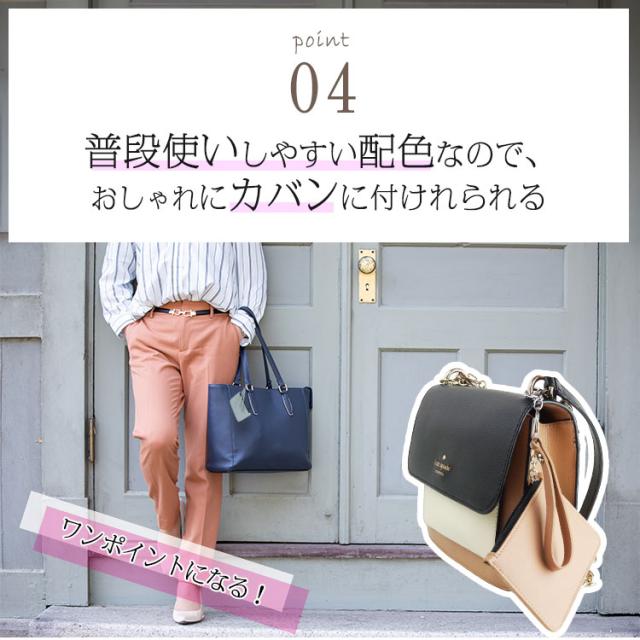 カバン等につけられるショートストラップ付き。カラビナに鍵やキーホルダーなども取り付け可能。