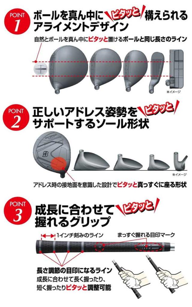 | グリップ(Type130、150共通) | 1W、FW、UT、IRON用 : ブリヂストンゴルフ ジュニアオリジナルラバーグリップ(バックライン有り/ブラック) GLHJM 口径 φ54/重さ 35g |