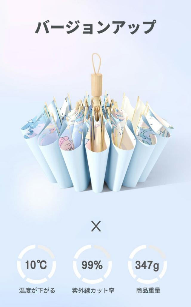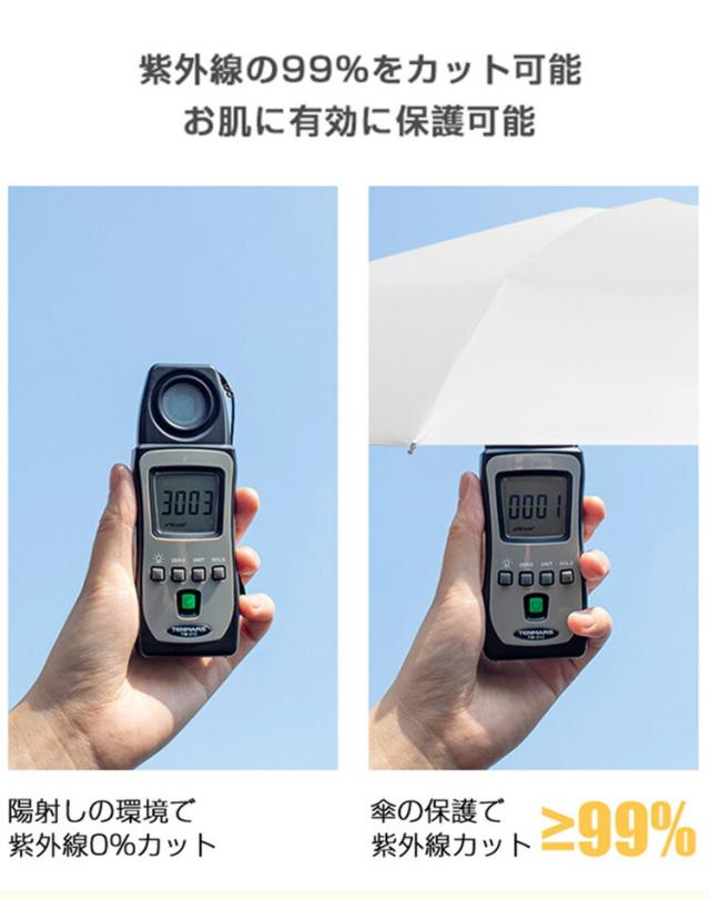 特徴【日焼け止100%】こだわりのポリエステル生地を採用して、熱と紫外線をシャットアウトします。折りたたみ傘は遮光率100%、UVカット率99.9%、撥水?耐風性能を備えたおしゃれな折りたたみ晴雨兼用日傘。傘布は皺が生じにくくて、いつでもファッションな外観を保持した折り畳み傘です!