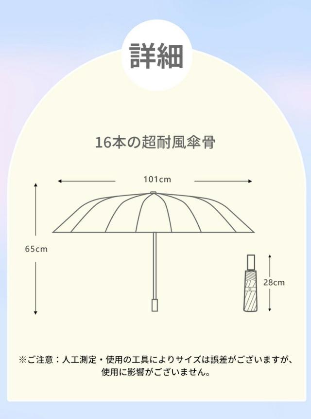 | 商品名 | 折りたたみ傘 16本傘骨 日傘 雨傘 折り畳み日傘 耐風構造 完全遮光遮熱 UVカット率99% 晴雨兼用 日焼け防止 超耐風撥水 梅雨対策 おしゃれ マルチカラー シンプル 無地 携帯しやすい 小型 軽量 ミニ傘 丈夫 頑丈 通勤 レディース 男女兼用 使いやすい プレゼント | |||||
