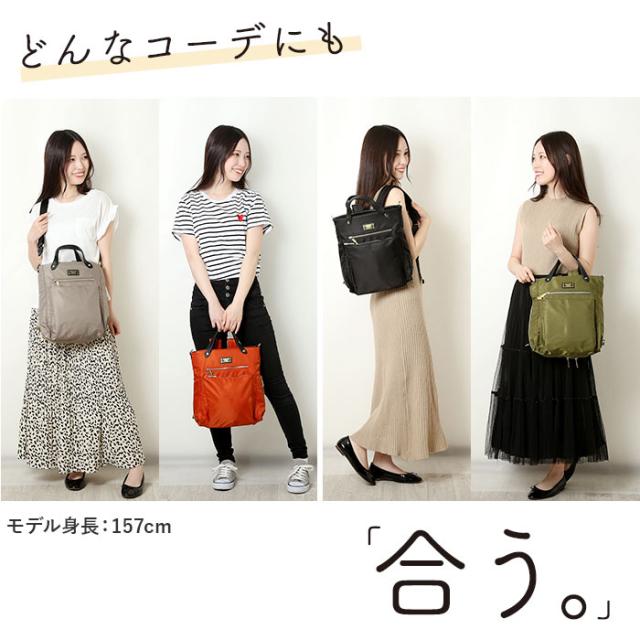 | サイズ | [縦]約33cm/[横(底部)]約25cm/[マチ]約7cm・約14cm [リュック用ショルダー]約48cm〜約81cm(調節可能) [肩掛け用ショルダー]約80cm〜約140cm(調節可能)/[持ち手]約23cm ※サイズは当店計測の実寸サイズです。実際の商品ならびにメーカー表記サイズとは多少の誤差が生じる場合がございます。あらかじめご了承ください。 |