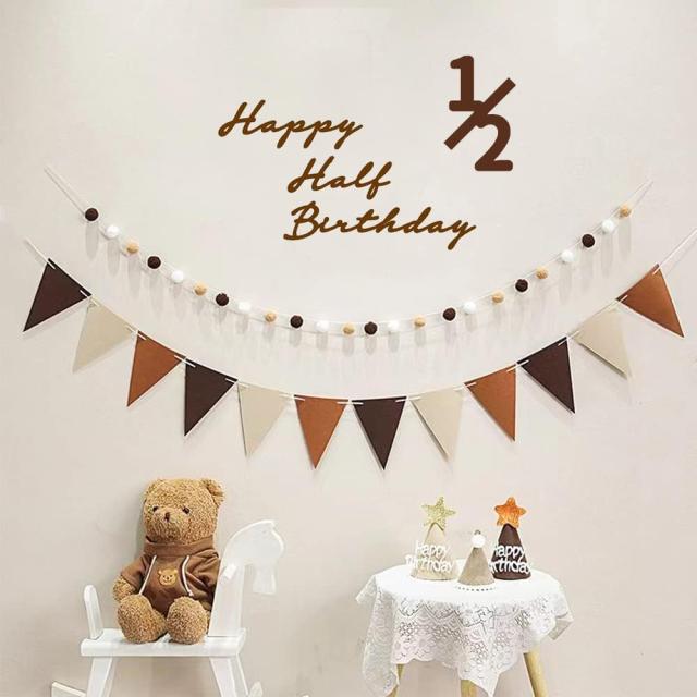 ・商品仕様 happy birthdayフェルト生地バナーx1、160cmフェルト生地フラッグガーランドx1、250cm フグボールガーランドx1、1/2歳の数字x1。