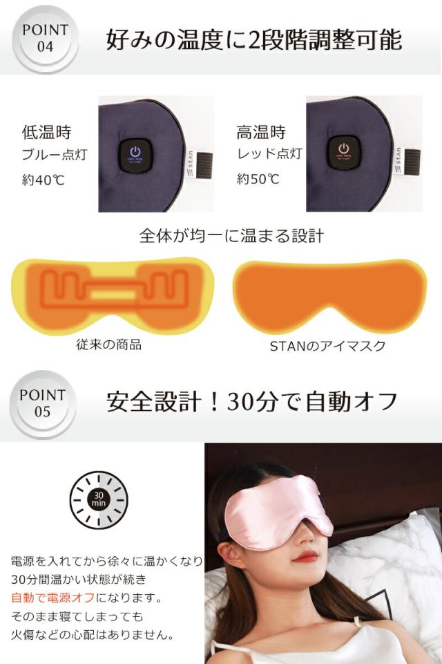 温めは全体が満遍なく温まるような設計になっています。また30分で温めが自動オフになりますので、そのまま朝までアイマスクとしてもお使い頂けます。