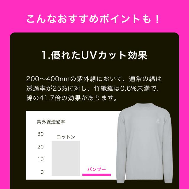 コットンの1.7倍の吸放湿性を誇るバンブーレーヨンは、素早く水分を吸い、乾きやすさに優れているため、汗による肌のベタつきを軽減し、快適な着心地を持続させます。