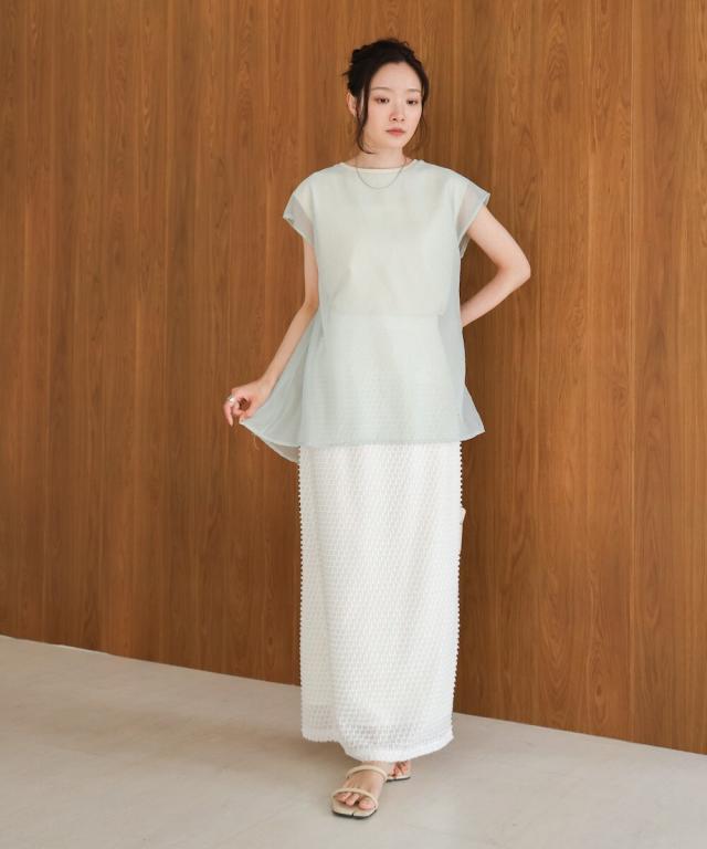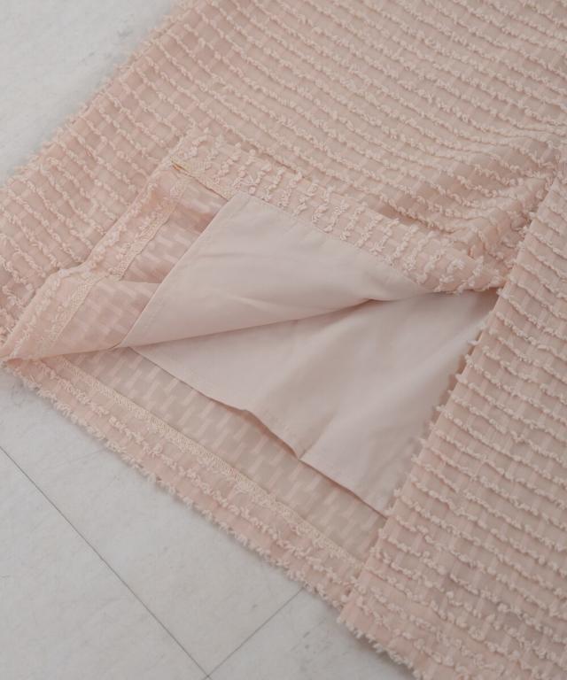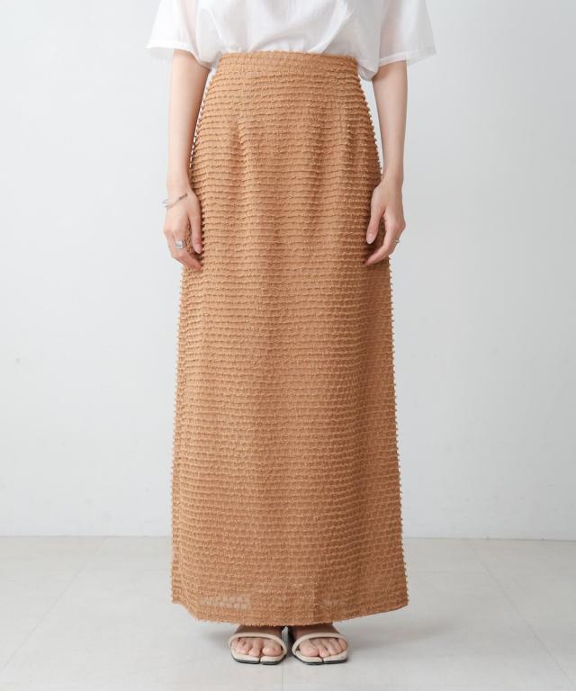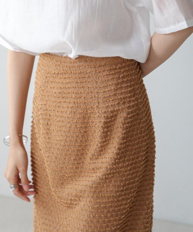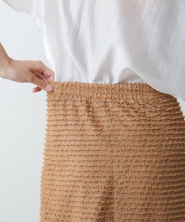 表面感のあるミニフリンジがボーダー状にあしらわれたデザインスカートです。トレンドライクなテキスタイルでコーディネートをパッと華やかにします。シルエットはすっきり見えのIラインで、足さばきの良いスリットが抜け感を演出。サイドファスナーで着脱する仕様で、ウエスト背面にはゴムも仕込んであり見た目よりもイージーな着心地です。