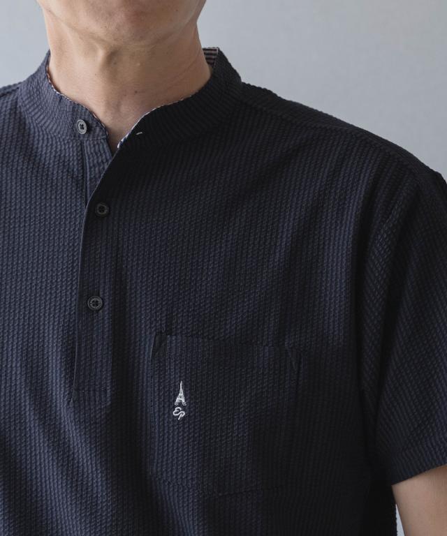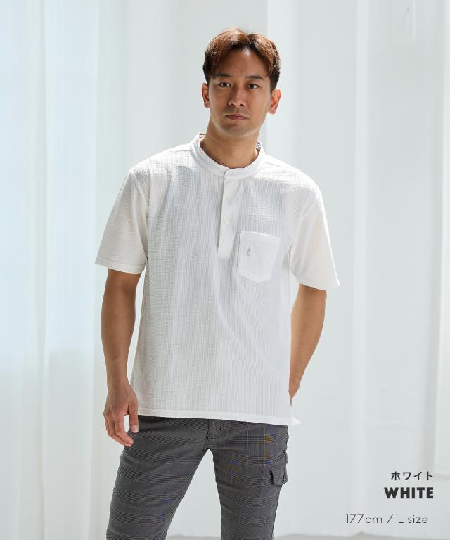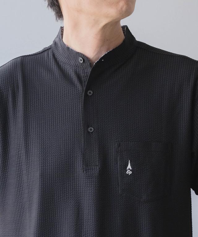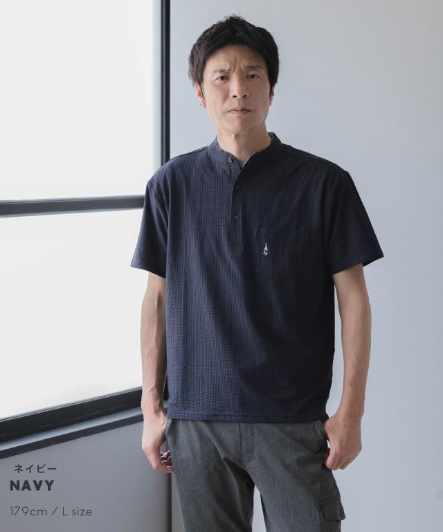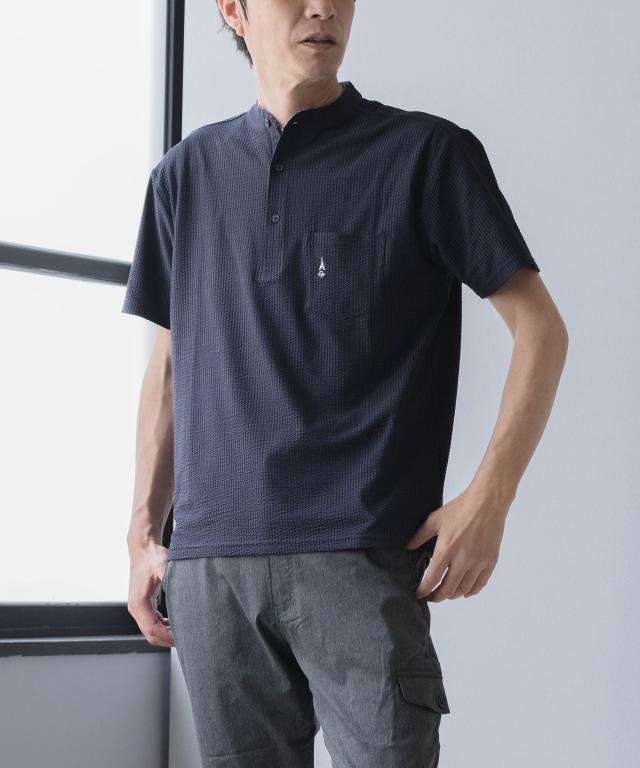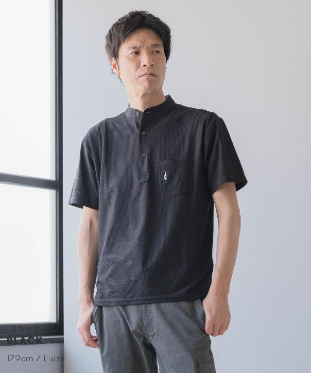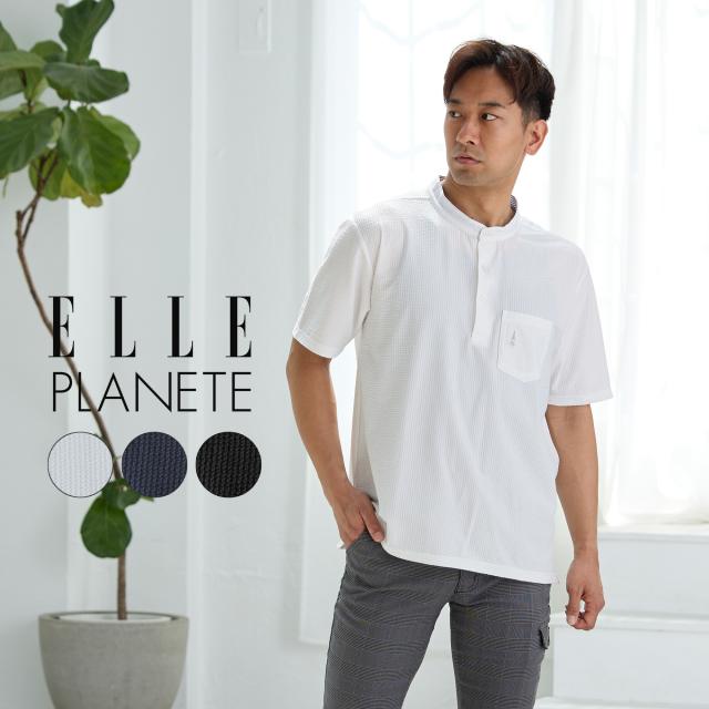 バンドカラー シャツ メンズ Tシャツ ポロシャツ シアサッカー 接触冷感 吸水 速乾 通気性 ELLE PLANETE エルプラネット ブランド ヘンリーネック 夏 秋 春 30代 40代 50代 60代 70代 ギフト プレゼント 贈り物 ラッピング 可能 ブラック ネイビー ホワイト ポケット 父の日