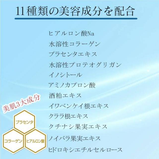 水、グリセリン、ペンチレングリコール、ヒアルロン酸Na、水溶性コラーゲン、プラセンタエキス、水溶性プロテオグリカン、グリチルリチン酸2K、イノシトール、アミノカプロン酸、酒粕エキス、イワベンケイ根エキス、クララ根エキス、クチナシ果実エキス、ノイバラ果実エキス、ヒドロキシエチルセルロース、BG、クエン酸Na、クエン酸、フェノキシエタノール