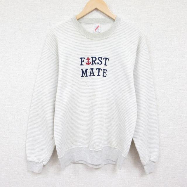 古着 ジャージーズ 長袖 スウェット メンズ 80年代 80s FIRST MATE 刺繍 クルーネック USA製 薄グレー他 ボーダー Lサイズ 中 中古 古着
