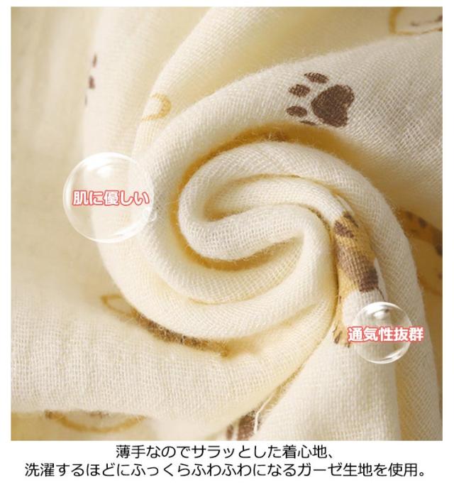| ふんわりとしたガーゼ素材が肌に心地良い、お子様向けルームウェア。 80cm〜140cmと豊富なサイズ展開! 薄手なのでサラッとした着心地、洗濯するほどにふっくらふわふわになるガーゼ生地を使用。 通気性、吸水性、速乾性に優れており、適度な保温性があり寝る時も着心地が良く快適です。 薄手の長袖なので、春・秋はもちろん、夏のエアコンが効いた部屋でも活躍します。 通気性が良く綿なので、敏感肌など肌の弱い方からもご好評いただいています。 お泊り保育やお友達とのお泊り会、修学旅行に、プレゼントやギフトなどにもお勧めです。 | |