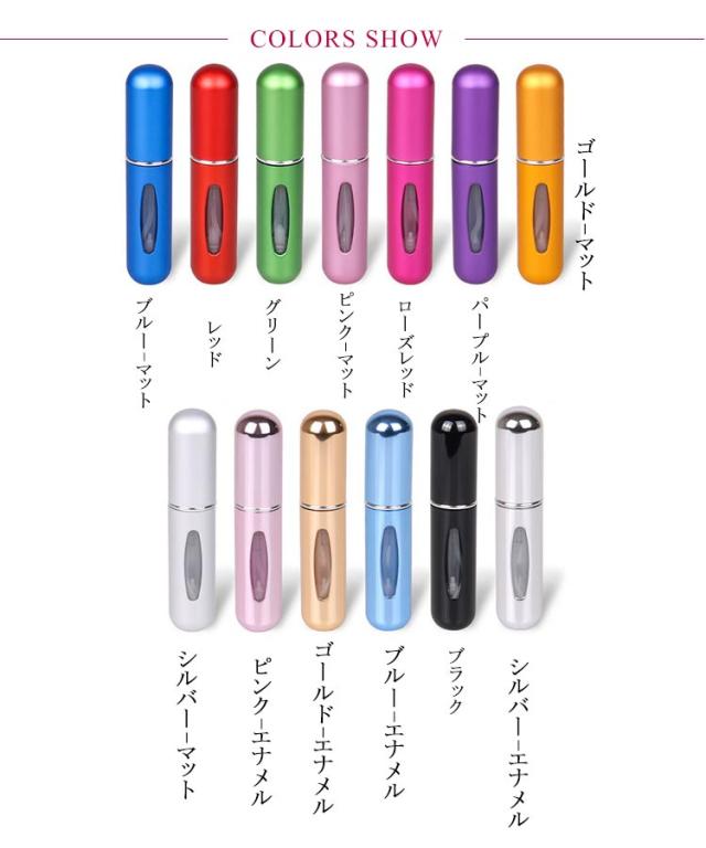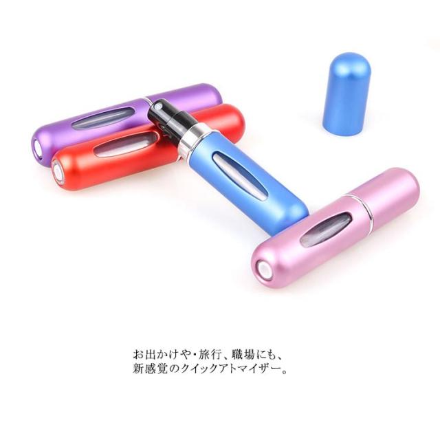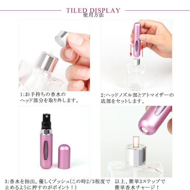 | 簡単詰め替え 香水クイックアトマイザー 旅行やお出かけに便利な、コンパクトサイズ 5mlの機内持ち込みサイズで、金属製CNC圧力バルブで空気圧変動による液漏れを防ぎます。 香水ノズルに押し当てて補充するタイプで簡単に詰め替えることができます。 スパイラル内部構造の霧状噴射ノズルで1プッシュの噴射量を節約。 お出かけや・旅行、職場にも、新感覚のクイックアトマイザー。 使用方法 1:お手持ちの香水のヘッド部分を取り外します。 2:ヘッドノズル部とアトマイザーの底部をセットします。 3:香水を抽出。優しくプッシュ(この時2/3程度で止めるように押すのがポイント!) 以上、簡単3ステップで簡単香水チャージ! | |