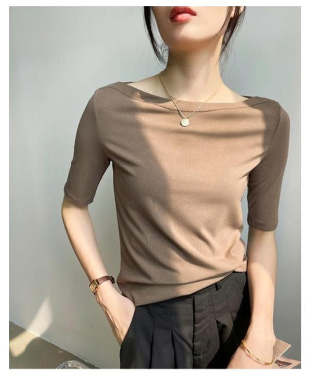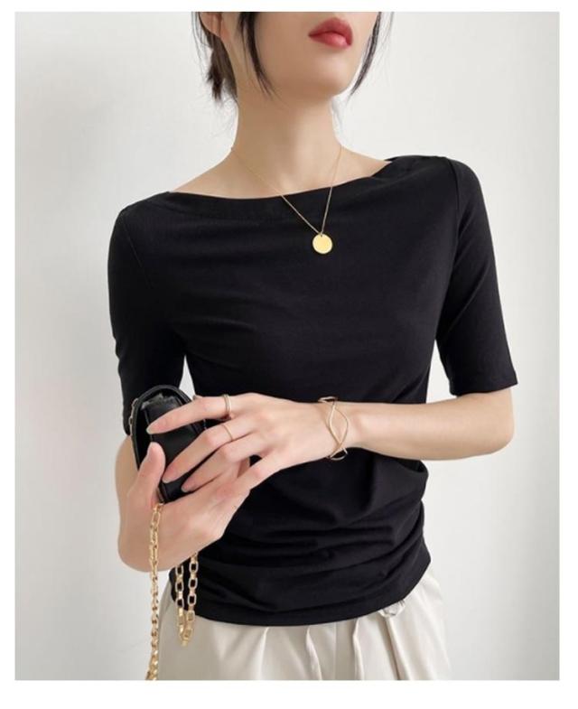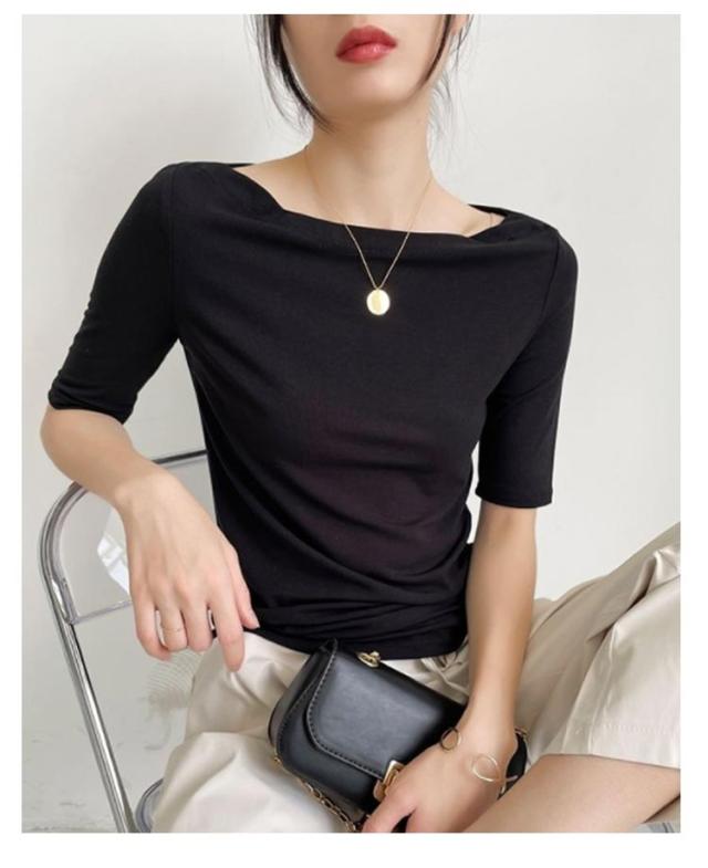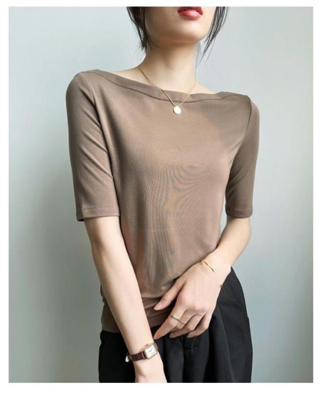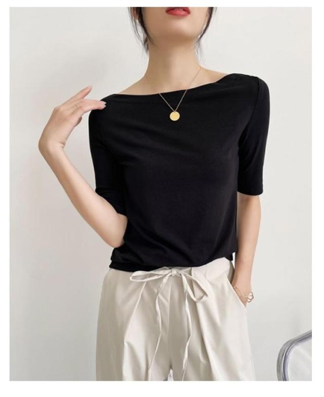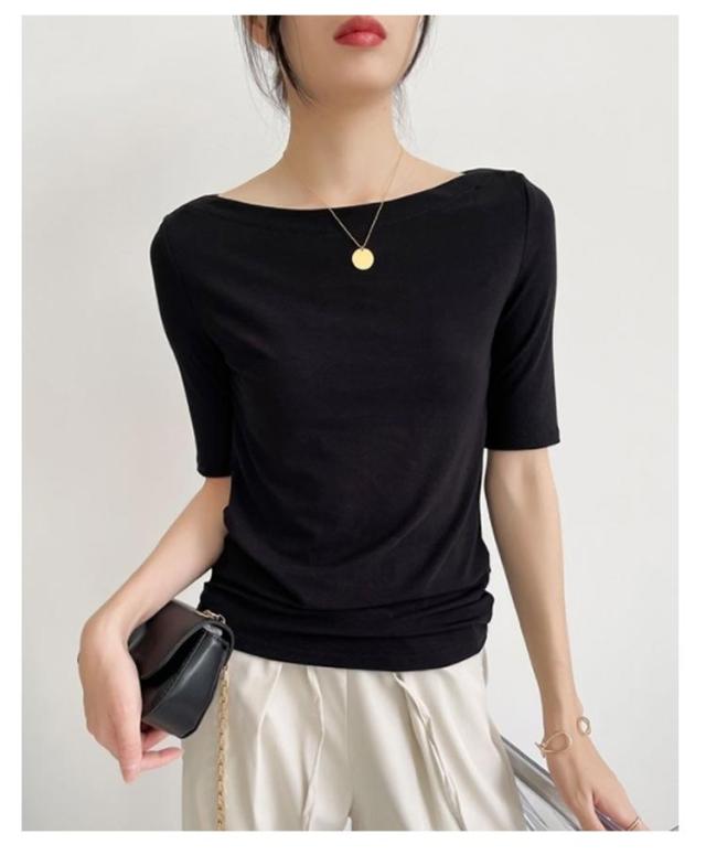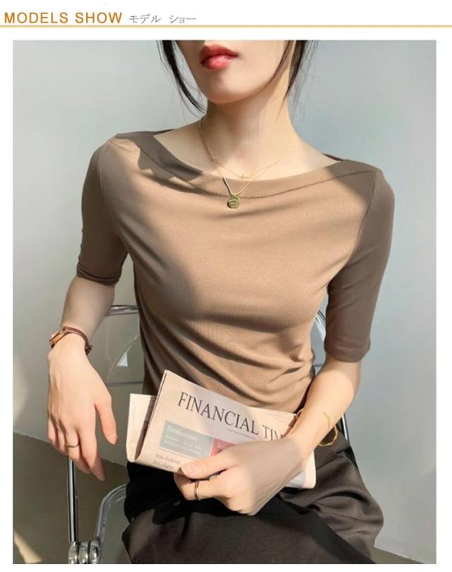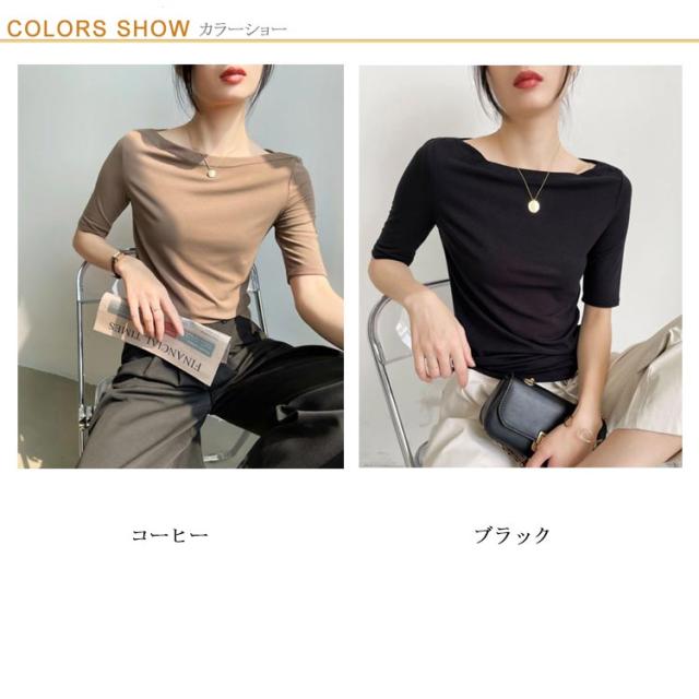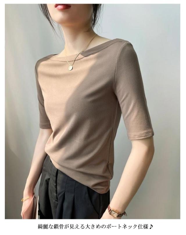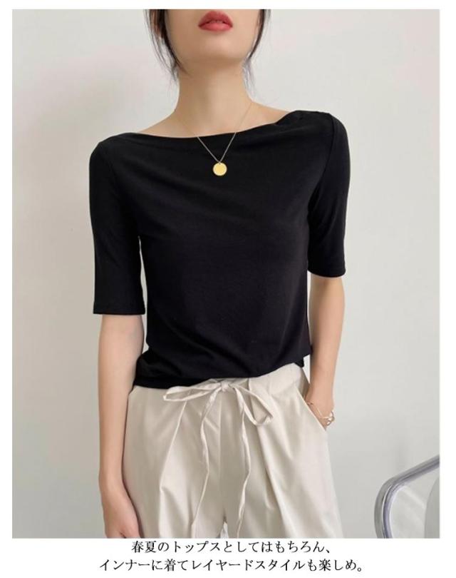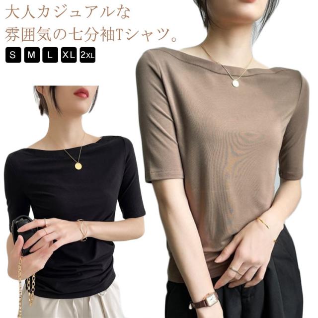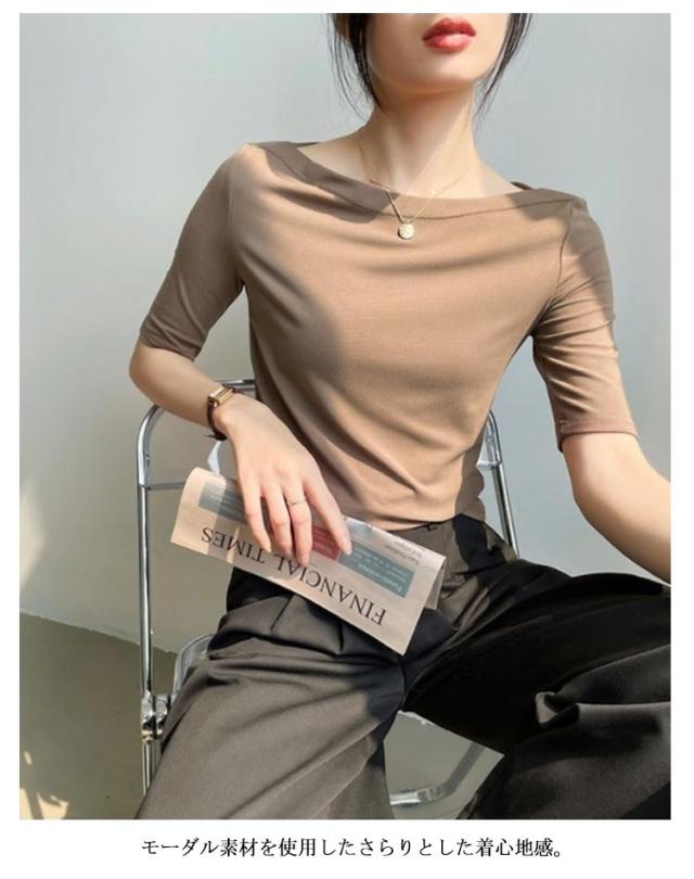 Tシャツ 無地 レディース Tシャツ ボートネック5分袖 カットソー UVカット 半袖 モーダル素材 カジュアル シンプル 大きいサイズ トップス ストレッチ おしゃれ レディース 黒 春 夏