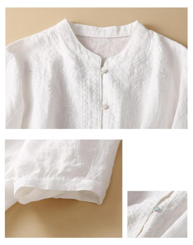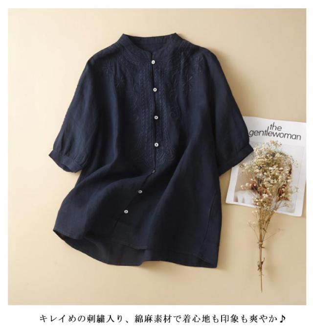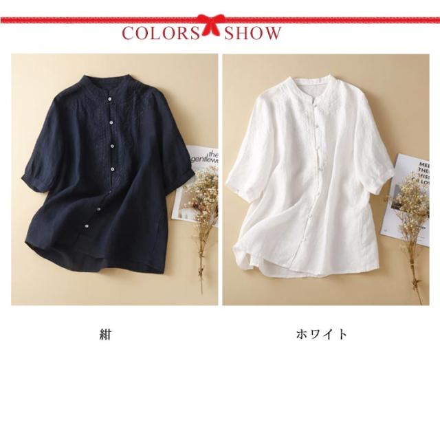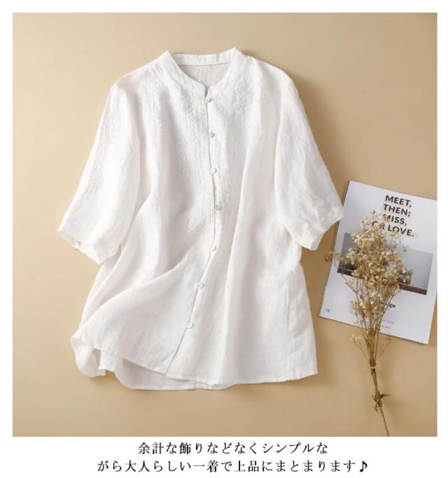 半袖 ゆったり チュニック おしゃれ ブラウス トップス 花柄刺繍 春 夏 レディース 綿麻ブラウス 大きいサイズ 刺繍 シャツ 5分袖 ナチュラル 白シャツ 綿麻ブラウス きれいめ 体型カバー カジュアル ナチュラル