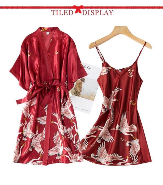 2点セット アイスシルク ロングガウン ロングキャミソール付き サテン調 パジャマ ネグリジェ ルームウェア 前開き Vネック ナイトウエア 鶴柄 春秋夏 可愛い セクシー 母の日