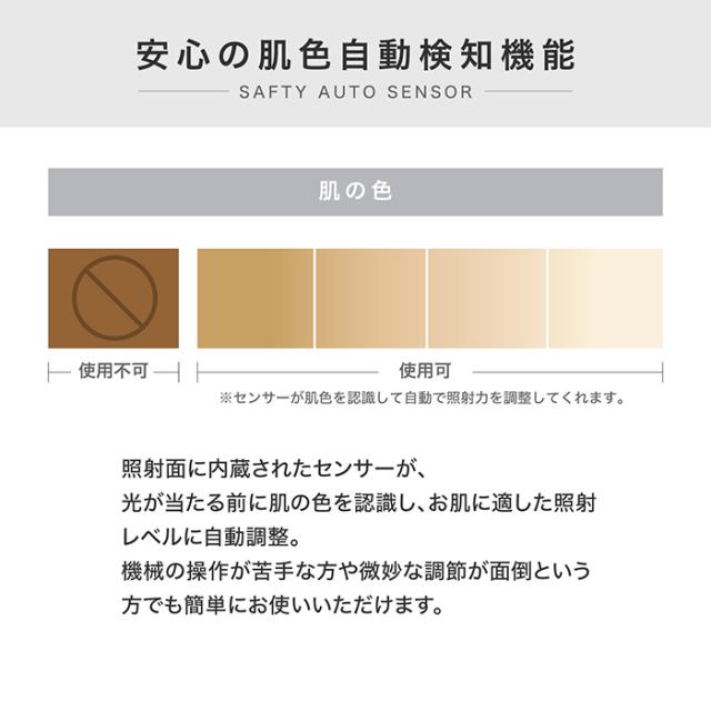 照射面に内蔵されたセンサーが、光が当たる前に肌の色を認識し、お肌に適した照射レベルに自動調整。