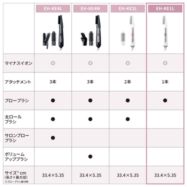 商品名 パナソニック くるくるドライヤー イオニティ EH-KE1L メーカー パナソニック メーカー型番 EH-KE1L-W カラー ホワイト メーカー保証期間 1年 電源方式 交流式 温風温度 約120℃(ドライ・室温30℃の時) 電源コード長さ 1.7m 本体寸法 長さ33.4×最大径5.35cm(ブローブラシ取付時) 本体重量 約335g(ブローブラシ取付時) 機能 マイナスイオン 電源 AC100V 50-60Hz 消費電力 700W(DRY時) 生産国 タイ 付属品 ブローブラシ