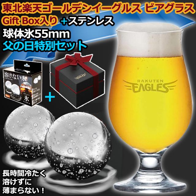 父の日特別セットギフト 東北楽天ゴールデンイーグルス ビアグラスGift Box入り+ステンレス球体氷55mm 2個入り ドイツ製グラス 冷たさキープ 溶けない 薄まらない
