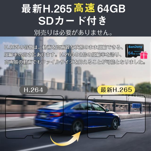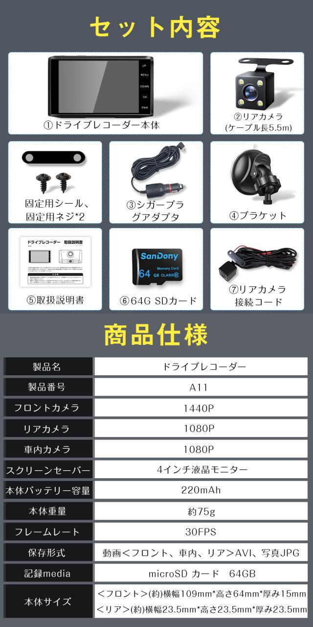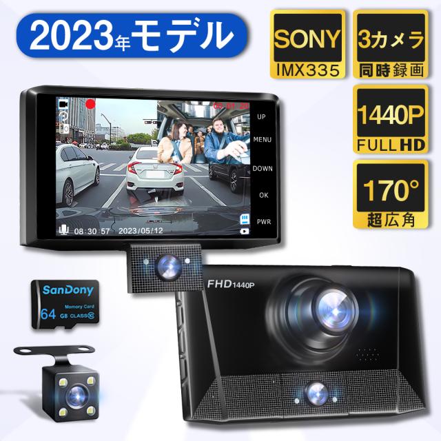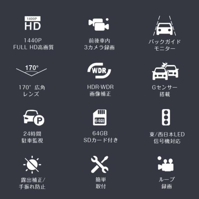 【NEW】ドライブレコーダー 前後 ドラレコ SDカード 64GB 車載カメラ 3カメラ 高画質 Gセンサー バックカメラ 動画 HD 記録 1440P 安心 駐車監視 常時 安全 駐車 あおり 同時録画 ループ録画 HDR WDR 衝撃録画 前後カメラ 敬老の日 ギフト