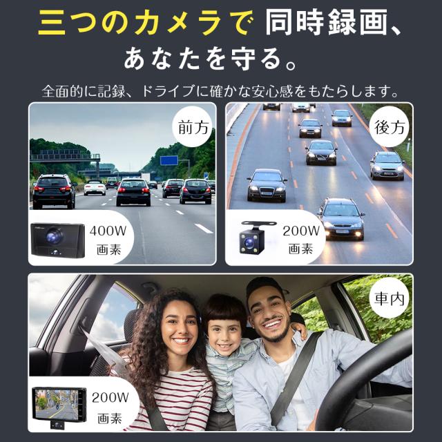 3カメラ同時に録画できる 。前後をしっかり撮影しつつ、車内まで記録するので、近年話題になっている煽り運転、その他追突事故に合った時などドライブレコーダーの映像が大切な証拠となります。
