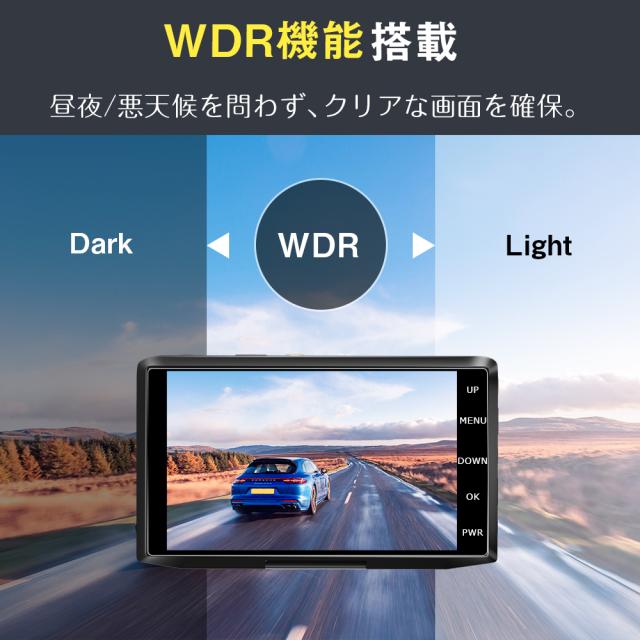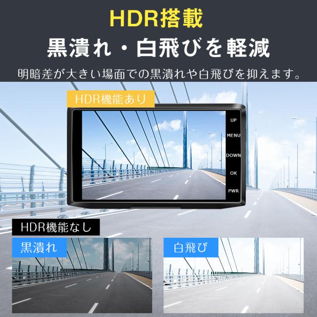 ??【WDR&HDR搭載】 前後カメラにWDR/HDR機能を搭載して、黒つぶれや白飛びを防止。 夜間やトンネル内など明度差のある場面でもしっかり補正して、鮮明な映像を記録します。