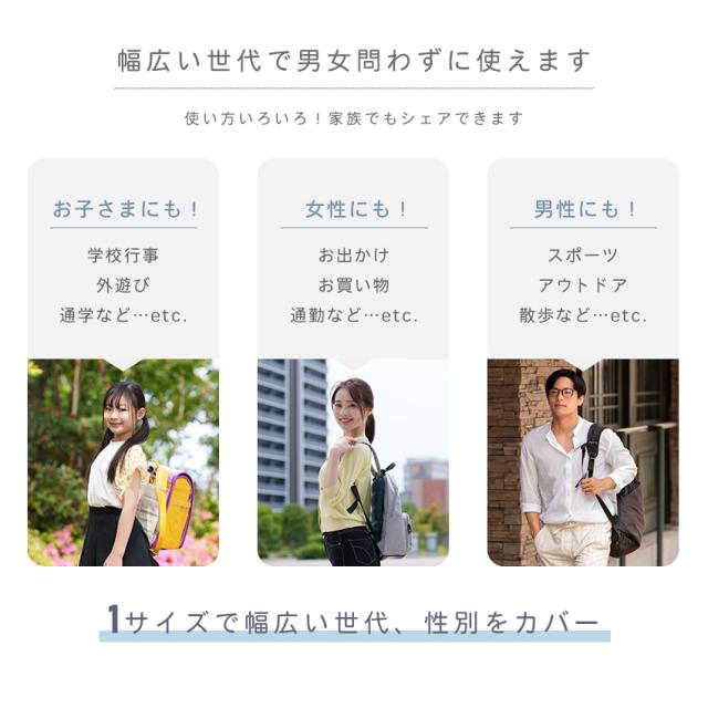 | お子さまに…学校行事、外遊び、通学など 女性に…お出かけ、お買い物、通勤など 男性に…スポーツ、アウトドア、散歩など |