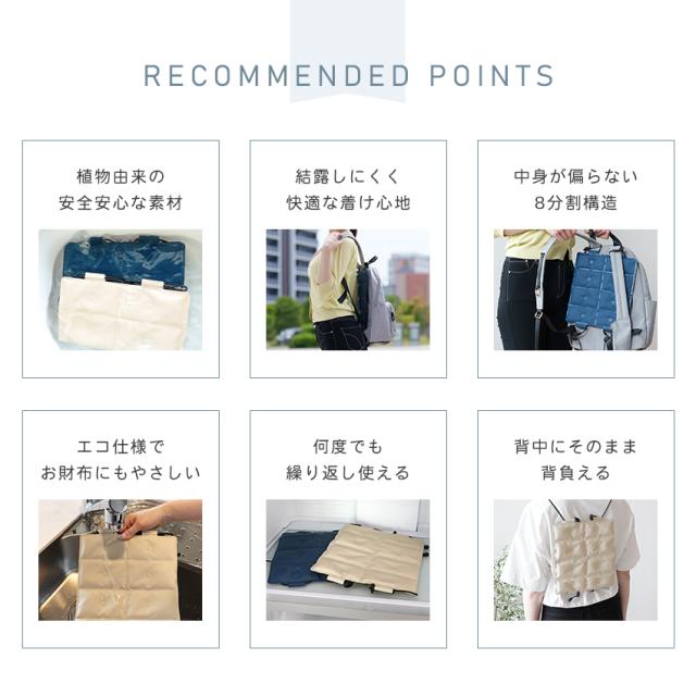 | 【繰り返し使えるエコ仕様】 お出かけの準備前や作業前などにセット。 短時間で凍結するので使いたい時にさっと使えます。 |