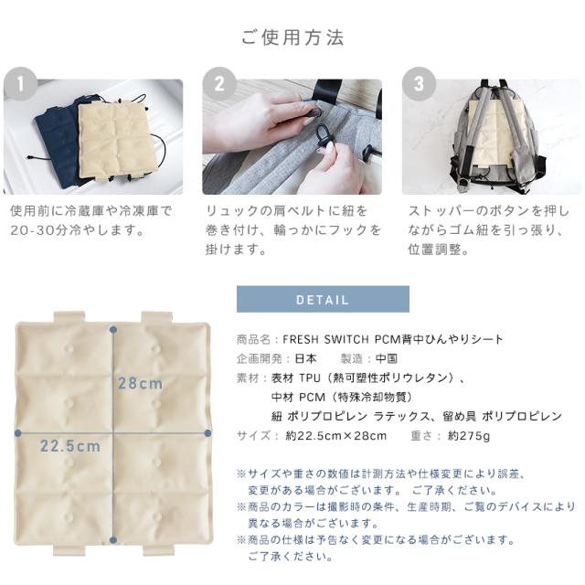 | 【DETAIL】 商品名:FRESH SWITCH PCM背中ひんやりシート サイズ:約22.5cm×28cm 重さ:約275g 素材:表材 TPU(熱可塑性ポリウレタン)/ 中材 PCM(特殊冷却物質)/ 紐 ポリプロピレン ラテックス、留め具 ポリプロピレン 製造:中国 |