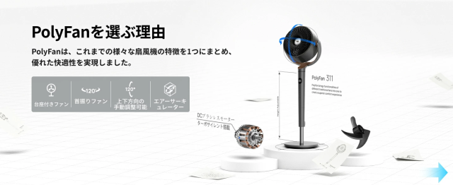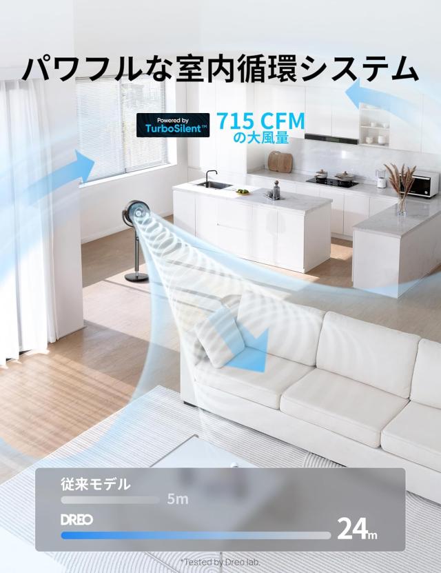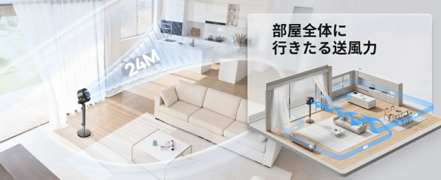 DREO Polyfan 311は、台座付きファン、首振りファン 、サーキュレーションファンを組み合わせた製品です。Dreo の Turbosilentテクノロジーを使用すると、空気が吹き飛ばされるだけでなく、リビング、寝室、オフィス、その他の屋内スペースの隅々までカバーされます。ファンの最大送風距離は24メートルに達し、部屋の隅々まで風が届きます。