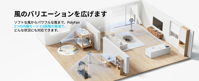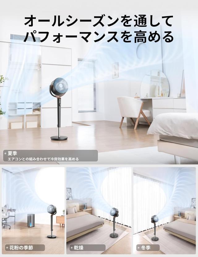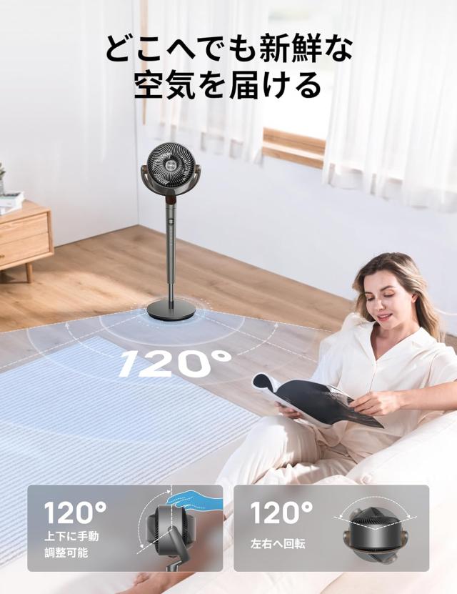 風量は3つの風モード、8段階と細かく設定できるので、日中・就寝時などシーンに合わせた心地よい風で快適に過ごせます。本製品は左右首振り120°、上下手動角度調整り120°、広範囲に効率よく風を届けます、空気循環・部屋干し効率を最大限に高めることができます、より良い空気循環効果を実現。夏に家族で涼む以外にもエアコンと併用して空気の循環に使ったり、梅雨時期の室内干しにサーキュレーターとして使ったりなど、いろいろな使い方ができます。
