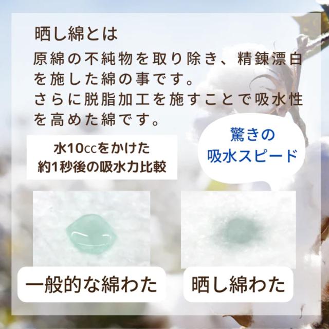 晒し綿とは、原綿の不純物を取り除き、精錬漂白を施した綿のことです。さらに脱脂加工を施すことで吸水性を高めています。