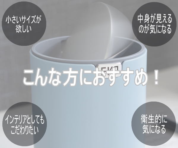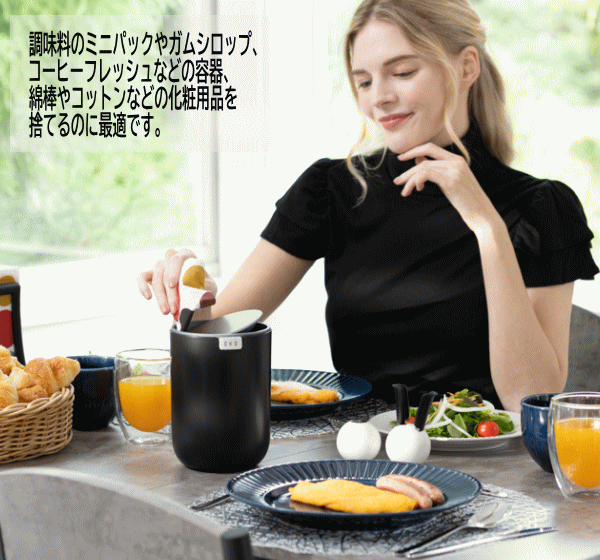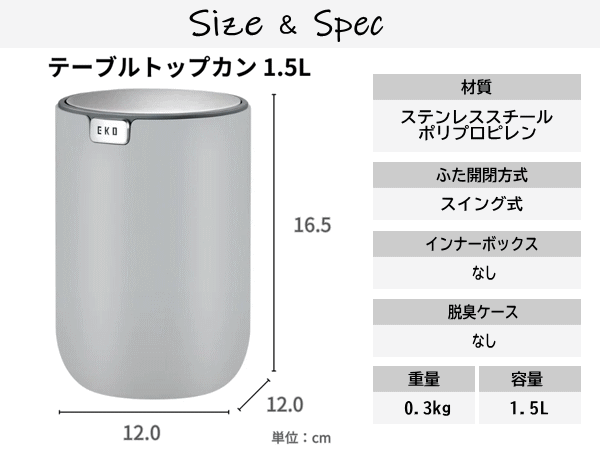机の上や洗面台まわりに置けるミニサイズのスイング式ゴミ箱です。コンパクトながらも機能的!フタが360°回転するのでゴミを捨てやすく中身が見えないので机の上に置いても気になりません。調味料のミニパックやガムシロップ、コーヒーフレッシュなどの容器、綿棒やコットンなどの化粧用品を捨てるのに最適です。本体はフタを外して中を丸洗いできるので汚れも臭いも気にせず常に清潔にお使い頂けます。1.5Lの容量はキッチンやデスク、洗面周りの小さなゴミを捨てるのに便利です。スイングカンの使い勝手の良さで日常の生活がより快適になります。■品名:テーブルトップカン■品番:EK9206MP-WH-1.5L、EK9206MP-MB-1.5L、EK9206MP-GR-1.5L、EK9206MP-TB-1.5L■容量1.5L■本体サイズ12.0×12.0×16.5cm■梱包サイズ12.5×12.5×17cm■重量0.3kg■主な材質:ステンレススチール/ポリプロピレン■カラー:ホワイト、ブラック、グレー、ブルー■生産国:中国■保証:国内1年保証