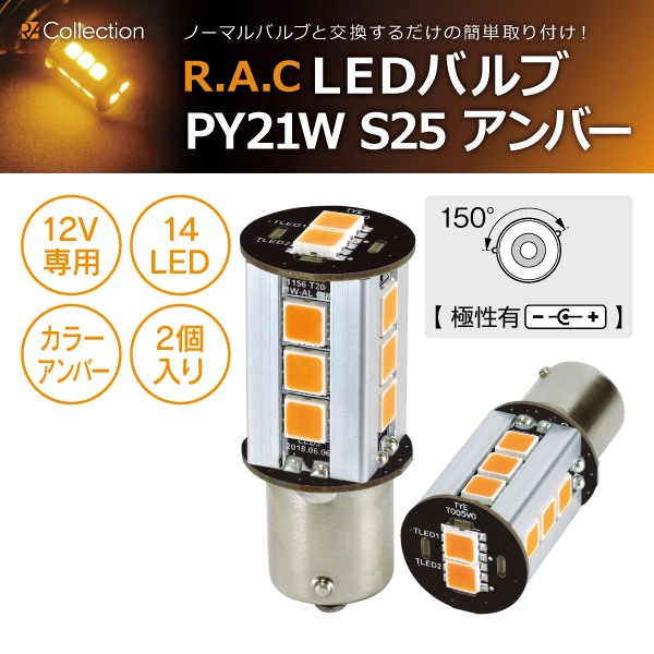 【在庫限】R.A.C LED PY21W S25 12V21W ハイフラ防止回路内蔵 発光色アンバー 2個入り ※極性有り (商品コード:500292)