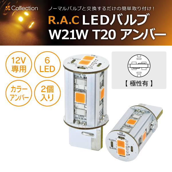 【在庫限】R.A.C LED W21W T20 12V21W ハイフラ防止回路内蔵 発光色アンバー 2個入り ※極性有り (商品コード:500293)