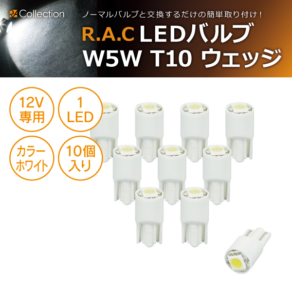 【在庫限】R.A.C LED W5W T10 12V5W ウェッジ 発光色ホワイト 10個入り (商品コード:500213)