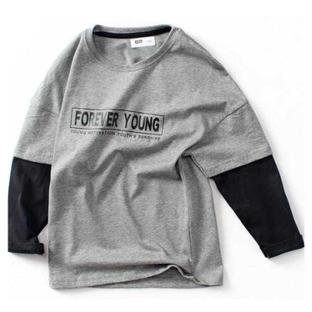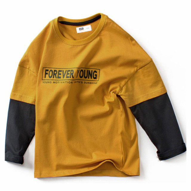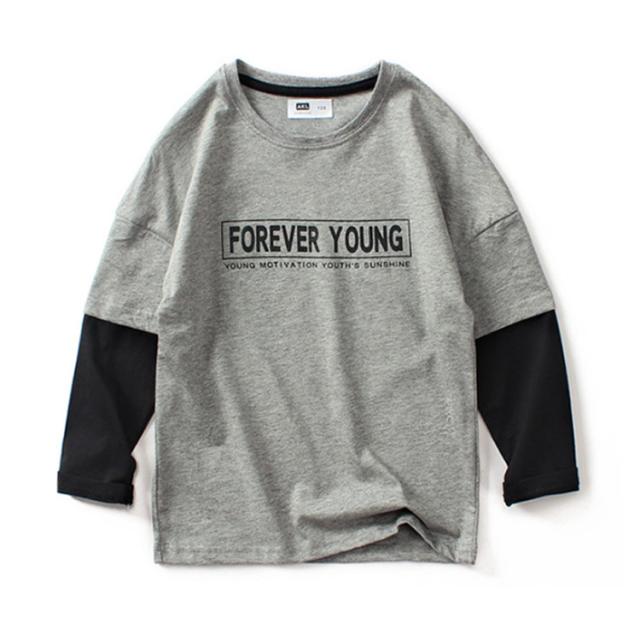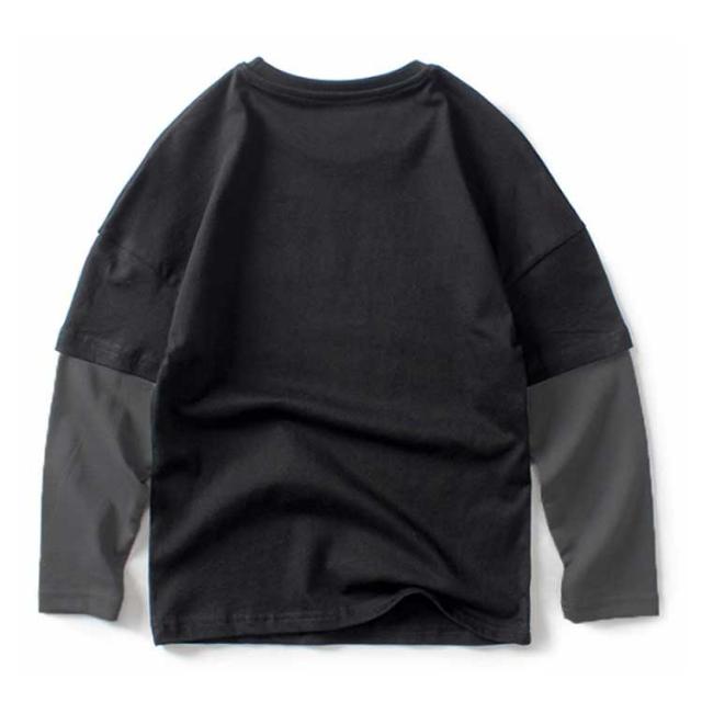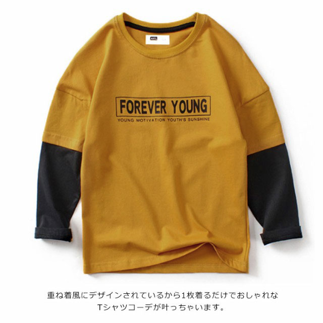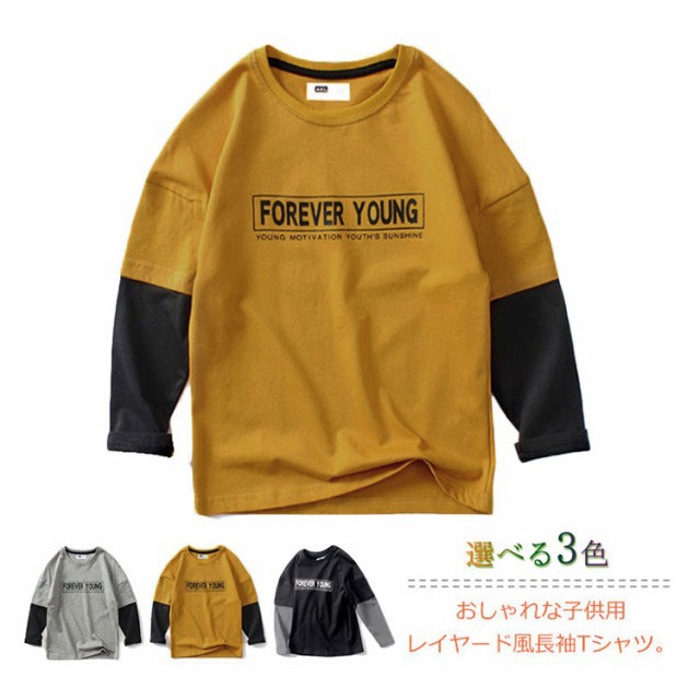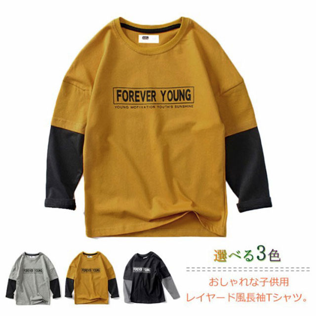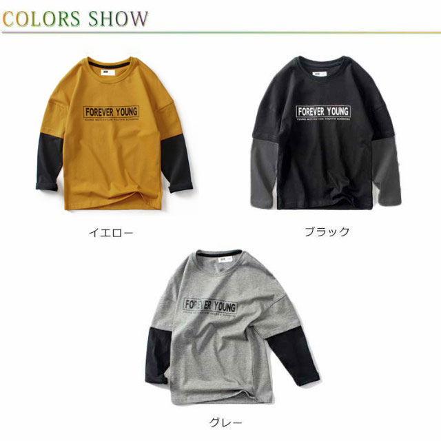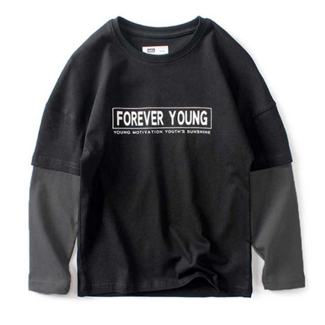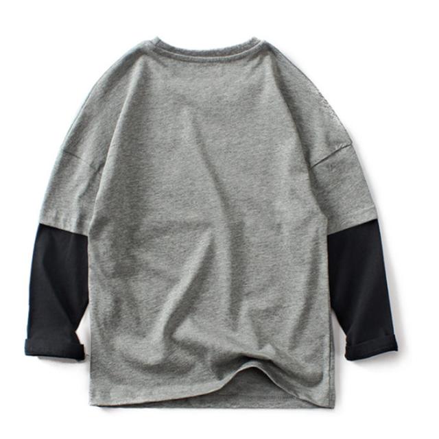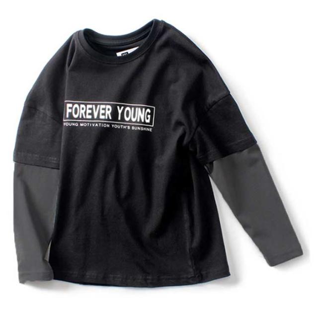 送料無料 Tシャツ キッズ 長袖 tシャツ カットソー 男の子 クルーネック ジュニア レイヤード風 子供服 重ね着風 プリント ボイス コットン100% 綿100% 春秋 春 秋