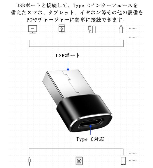 | 【商品名】 Type-C to USB 変換アダプタ 【サイズ】F 【素材】 合金 そのほか 【特徴】接続するだけでType-CをUSB端子に変換。USBポートと接続して、Type Cインターフェースを備えたスマホ、タブレット、イヤホン等その他の設備をPCやチャージャーに簡単に接続できます。コンパクトなサイズで持ち運びも便利。 | |