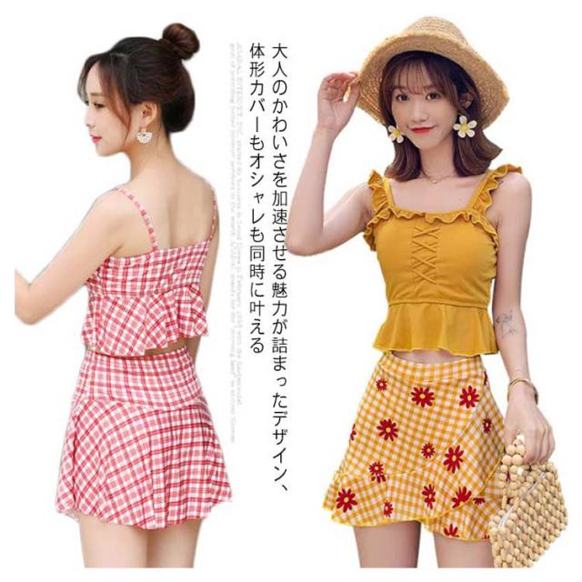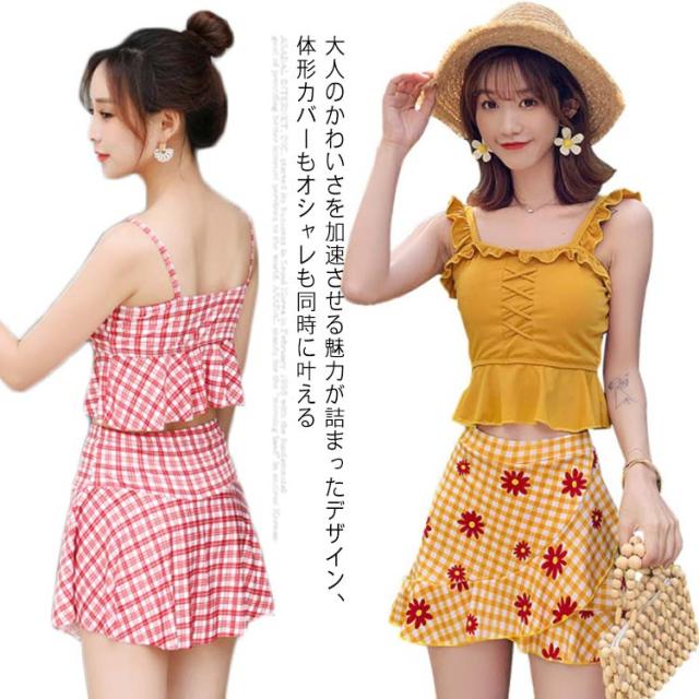 水着 レディース 体型カバー ワンピース ショートパンツ スカート セパレート サロペット オフショルダー スイムウェア タンキニ チェック柄 水玉 無地 2点セット 20代