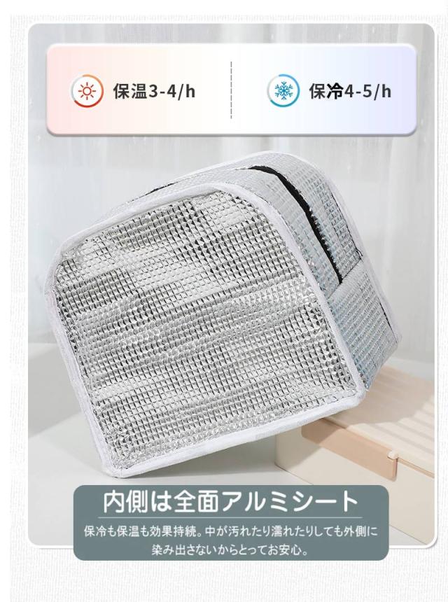 内側はアルミ箔の保温設計で、保温にも保冷にも効果が非常に良い。(保冷の際は保冷剤を一緒に使うともっと効果的。)万が一、不注意でおかずの汁が溢れても、雑巾で拭き取れば簡単にに取れちゃう。 厚手のオックスフォード生地で、丈夫で長持ちできる。カラーストライプ柄で、シンプルで上品な仕上がり。防水設計なので、雨に濡れる心配もなければ、中の汁が漏れる心配もない。