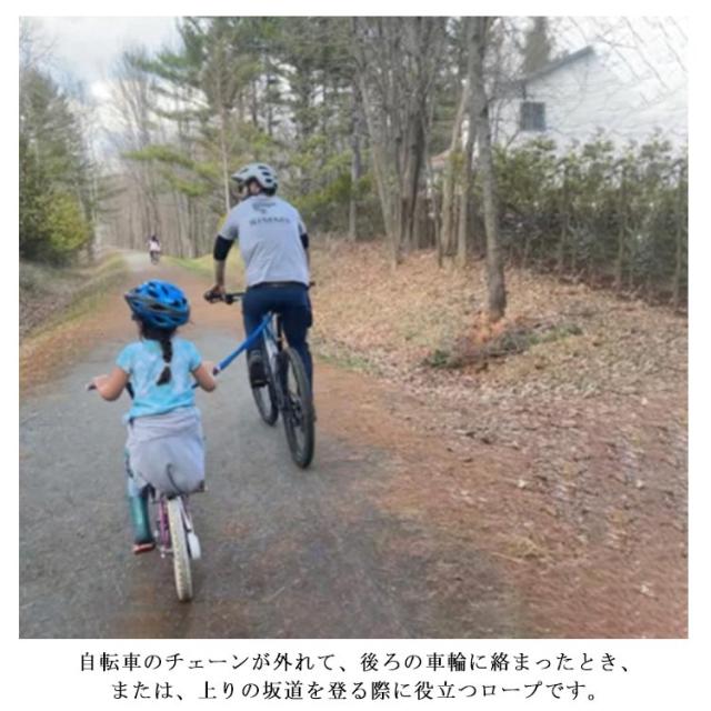 | 子供と一緒にサイクリングが楽しめる牽引ロープ! 自転車のチェーンが外れて、後ろの車輪に絡まったとき、または、上りの坂道を登る際に役立つロープです。 切れにくい丈夫なナイロン製です。 内部には伸縮性や弾力性に富む素材を使用。 犬用リードとして、自転車に乗りながら犬を散歩させていることもおススメ。 | |