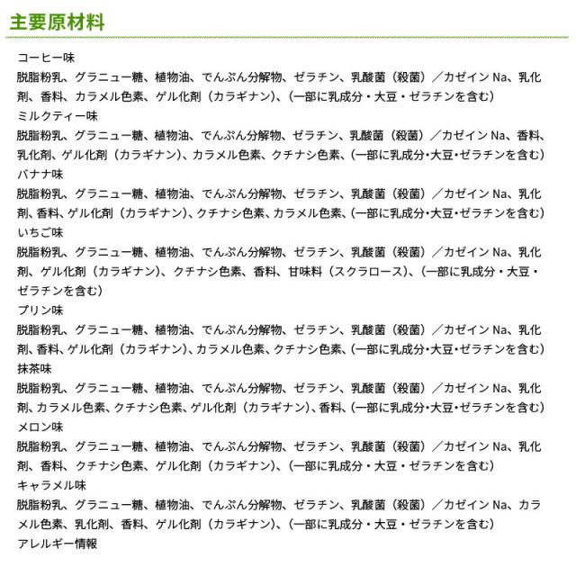 脱脂粉乳、グラニュー糖、植物油、でんぷん分解物、ゼラチン、乳酸菌(殺菌)/カゼインNa、カラメル色素、乳化剤、香料、ゲル化剤(カラギナン)、(一部に乳成分・大豆・ゼラチンを含む)