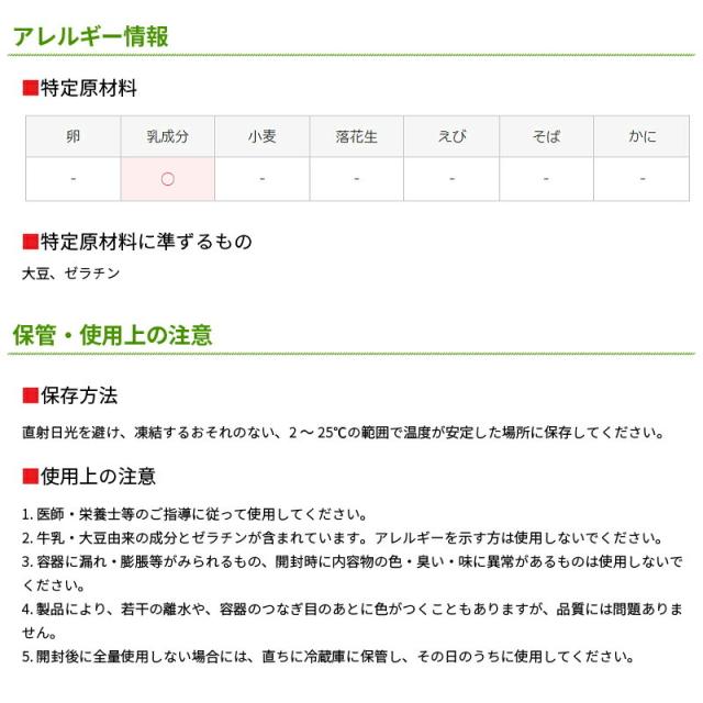2.牛乳・大豆由来の成分とゼラチンが含まれています。アレルギーを示す方は使用しないでください。