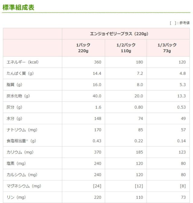 1.エンジョイゼリープラスは、1パック(220g)で360kcalのエネルギーが補給できます。