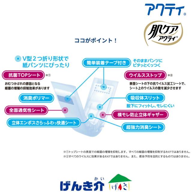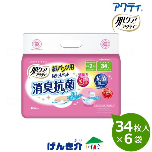 肌ケアアクティ 大人用紙おむつ テープタイプ用 紙パンツ用尿とりパッド 消臭抗菌プラス 2回吸収 1ケース(34枚入×6袋) 日本製紙クレシア W955728
