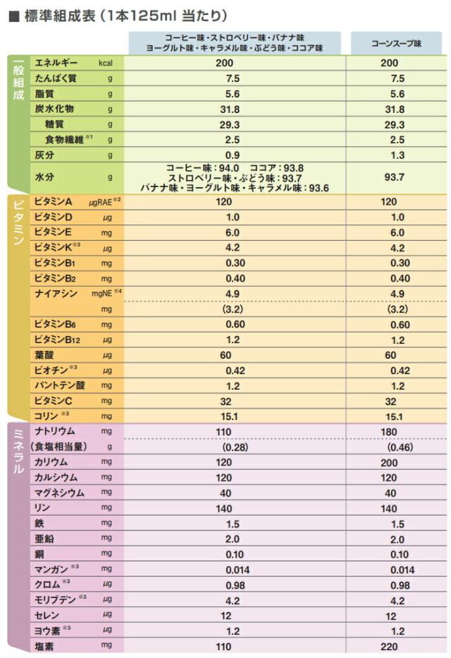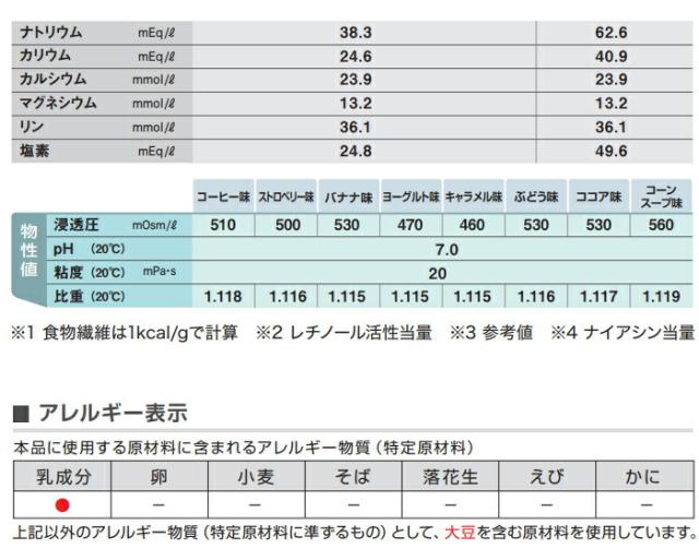 デキストリン、乳たんぱく質、食用油脂(なたね油、パーム分別油)、難消化性デキストリン、ショ糖、食塩、食用酵母/カゼインNa、香料、乳化剤、リン酸K、クエン酸K、塩化K、クエン酸Na、炭酸Mg、調味料(アミノ酸等)、V.C、pH調整剤、グルコン酸亜鉛、V.E、硫酸鉄、クチナシ色素、ナイアシン、パントテン酸Ca、V.B6、グルコン酸銅、V.B1、V.B2、V.A、葉酸、V.B12、V.D、(一部に乳成分・大豆を含む)